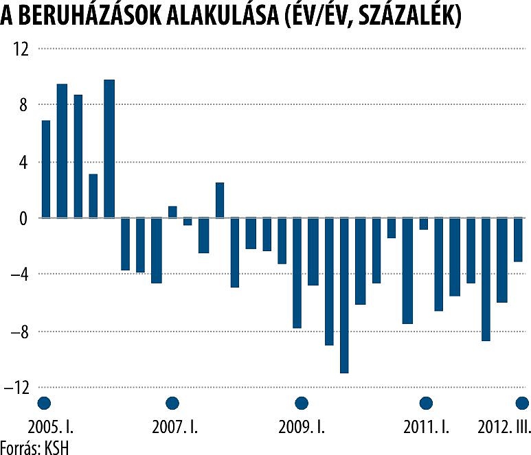 A beruházások volumene a Napi Gazdaság konszenzusa szerint az idei első negyedévi 8,6 és a második negyedévi 5,9 százalékos zsugorodás után mínusz 3 százalékra szelídülhetett július−szeptemberben − a trend azonban változatlan. A kisebb mínusz alapvetően a tavalyi alacsony bázisnak és néhány egyedi beruházásnak köszönhető. (A KSH csütörtökön teszi közzé legfrissebb adatait.) A külső kereslet gyengélkedése miatt a feldolgozóipar továbbra is rosszul teljesít, miközben a bizonytalan hazai gazdasági kilátások sem indokolnak jelentősebb bővítéseket, ráadásul a bankok vállalati hitelezése továbbra is rendkívül szigorú. Ugyanakkor az EU által finanszírozott közlekedésfejlesztési projektek, különösen a vasútfejlesztések a közeljövőben felfuthatnak, amit az ágazat rendelésállománya is jelez.