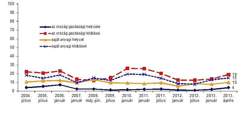 A Tárki Társadalomkutatási Intézet 2004 óta rendszeresen vizsgálja a magyar lakosság gazdasági helyzetértékelését. Az ország gazdasági helyzete és közeljövője, illetve a saját anyagi helyzet és kilátások alapján kirajzolódó kép az elmúlt szűk évtizedben sosem volt igazán derűs, de az utóbbi egy évben lényegében egy elhúzódó mélypontot mutat a grafikon. Hasonlóan mélyen volt az értékelések alapján felvázolható közhangulat pár évvel korábban, 2007 és 2009 között is, amely 2012 januárja és 2013 áprilisa között ismét igen alacsony szintet mutat.