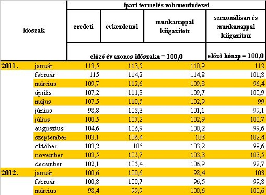 A munkanaphatástól megtisztított index 0,6 százalékkal emelkedett. A termelés az év első három hónapjában 0,1 százalékkal alacsonyabb volt, mint az előző év azonos időszakában. Az előző hónaphoz képest a szezonálisan és munkanaptényezővel is kiigazított ipari termelési index márciusban 0,6 százalékkal nőtt.