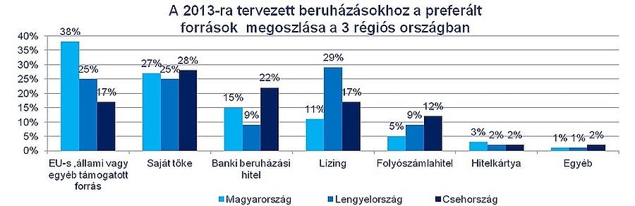 A magyar cégek legnagyobb része (38 százalék) EU-s, állami vagy egyéb támogatott forrásból szándékozik megvalósítani a fejlesztéseket, amely a legmagasabb arány a vizsgált országok közül. A második helyezett Lengyelországban is csupán 25 százalékuk alapozna támogatásokra. Külső finanszírozási forrást (beruházási- vagy folyószámlahitel, lízing, stb.) a vállalkozások egyharmada venne igénybe. Magyarországon a cégek kevesebb, mint egyharmada oldaná meg saját tőkéből a beruházást.