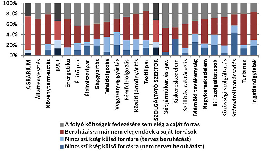 Összességében egyébként a megkérdezettek alig több mint 20 százaléka mondta azt, hogy javult a finanszírozási helyzete, 55,9 százalék szerint ez nem változott, míg 23,7 százalék mondta azt, hogy romlást érzékelt. A finanszírozási helyzet romlását leginkább a mérnöki szolgáltatást nyújtók (50 százalék), a fuvarozók (45 százalék) és a közösségi szolgáltatásokat végzők (38 százalék) érzik, míg a legnagyobb javulásról a növénytermesztők (42 százalék), az energetikában dolgozók (38 százalék) és az állattenyésztők (35 százalék) számoltak be.