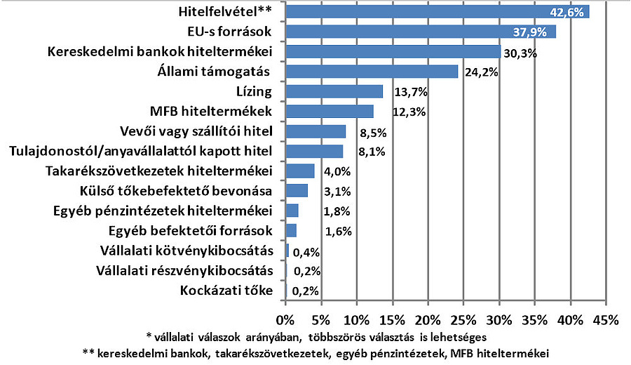 A hitelek népszerűsége továbbra is töretlen, a válaszadók 42,6 százaléka gondolkodik hitel/kölcsön felvételén, ezt az európai uniós források és az állami támogatások követik. Érdekesség, hogy kockázati tőkebefektetésben a cégeknek csak elenyésző hányada (0,2 százalék) gondolkodik, de nem népszerű a vállalati részvény- (0,2 százalék), illetve kötvénykibocsátás (0,4 százalék) sem. Az olcsó állami és közösségi források továbbra is elsősorban az agrárcégek körében számítanak különösen keresett pótlólagos finanszírozási formának. Átlagot meghaladó népszerűség jellemzi az európai uniós pénzeket a turizmus esetében, az állami forrásokat a textilipar és a közúti járműgyártó ágazatban, a hiteleket az energetikai és állattenyésztő cégek körében, ezenkívül az utóbbi szegmensben a lízing is átlag feletti vonzerőnek örvend.