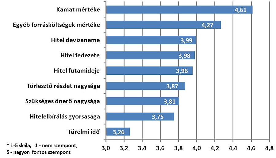 A hitelfelvételnél továbbra is a hitel abszolút mértéke a legfontosabb szempont, majd ezt követi az egyéb forrásköltségek mértéke, illetve a hitel devizaneme. A legkevésbé a türelmi idő és a hitelelbírálás gyorsasága számít a cégeknek. A cégek szerint egyébként a futamidővel kapcsolatos feltételek inkább javultak az elmúlt egy évben, hasonlóan a hitelbírálat gyorsaságához, míg az egyetlen negatív változást a devizaárfolyamok változása okozta. Ennek megfelelően a többség szerint a tavalyi évhez képest könnyebb lett előteremteni a kölcsönhöz szükséges saját erőt, de a hitel fedezetét is egyszerűbb bizonyítani a banknak.