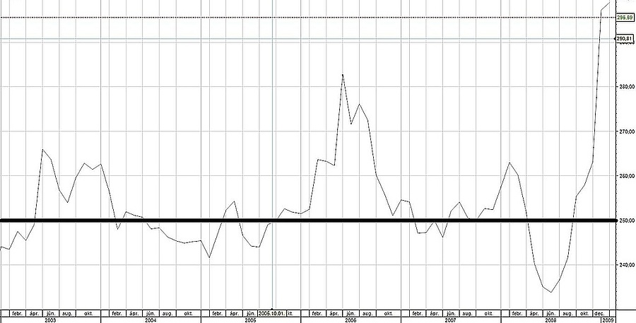 A képhez az is hozzá tartozik, hogy a törvény alapján a 250 forint feletti árfolyamon hitelt felvettek nem élhetnek a végtörlesztési lehetőséggel. Márpedig - amint az az alábbi ábrán is látszik - nem volt ritka, hogy a boom idején a vastag vonallal jelzett 250-es szint felett forgott az euró.