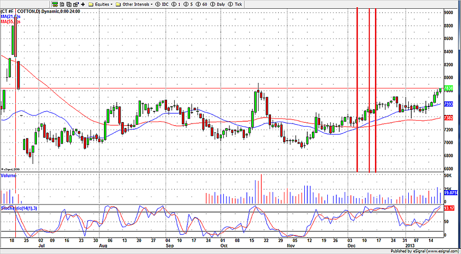 Első alkalommal december 6-án jeleztük előre, a kihívója akadhat Kínának cikkünkben, hogy emelkedés várható a gyapot piacán, hiszen a Kínai import visszavágása után a termesztők az árak feltornászása érdekében visszavágták a kínálat mennyiségét. Az akkor a 2013-as év közepére jósolt szint immár közelségbe került, hiszen, akkor 80-90 cent közé vártuk erre az időszakra az árfolyamot.